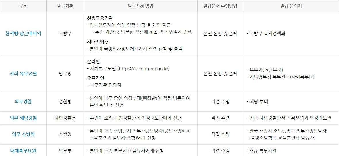 - 필요 서류 : 병역증, 전역증, 병적증명서, 복무사실확인서(대체복무요원) 중 택 1 (각 은행별 1부씩 제출)